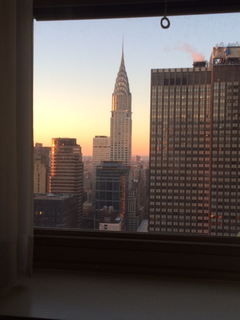 This morning, I got up early to see the sun rise over my new favorite Chrysler Building and guess what I saw? Very small in the distance – the Queen Mary 2 has docked. Our adventure has begun!