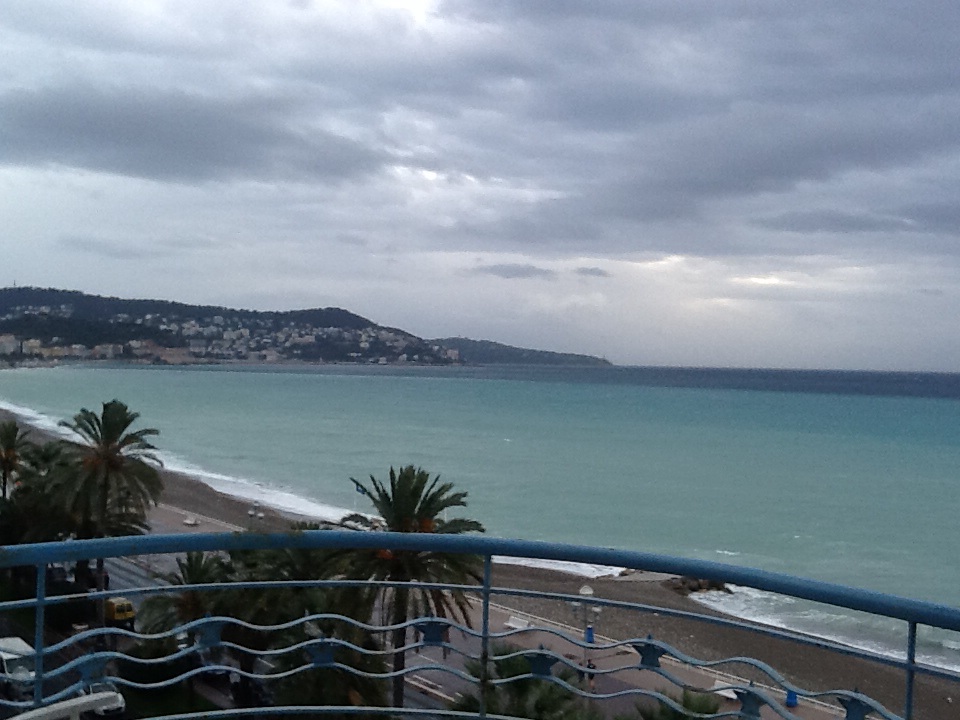 But soon our wonderful French contact, Anca, came and helped us into the building. We’ve rented an apartment for two weeks to live like the locals. It is in a Belle Époque building on the main strip – the Promenade des Anglais. It has many of the original furnishings, incuding a teeny tiny lift that can hold two people who stand very close together. Needless to say, if we didn’t fit in the taxi, we definitely didn’t fit in the teeny tiny elevator. We were like a comedy routine having to send a couple of bags up and send the lift back down while trying to understand that the “first” floor is really the second floor and ouvert means “open.” Whew.