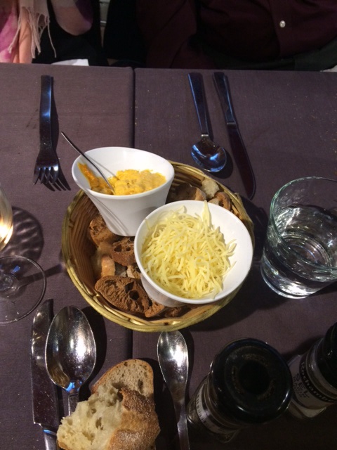 – BOUILLABAISSE – Fish stew that, to be official, must be made with 3-5 different varieties of fish, depending on whom you ask. They serve it with a basket of crusty croutons, shredded cheese, and a mustard made of olive oil, garlic, saffron, and cayenne pepper. You are supposed to smear mustard on the croutons, add shredded cheese to stick to the mustard, put the whole thing in your spoon, and dip into the broth. Delicious!