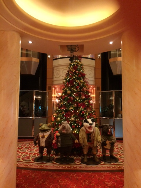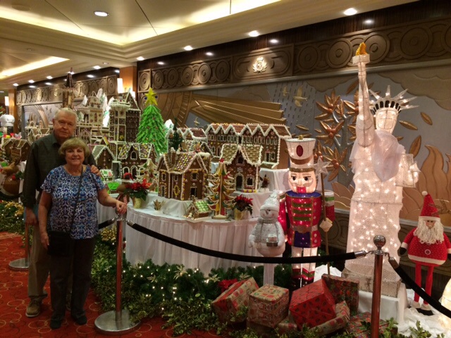 The ship is fully decorated for Christmas and beautiful. I’ve attached some pictures. There is a giant Gingerbread Village, all made of gingerbread or candy – 176 pounds of gingerbread! They are having a Christmas Market tomorrow in the Grand Lobby. We’re not sure what this is, but Mom and I are ready!