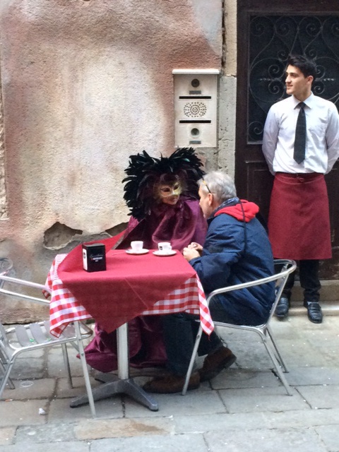 Now we are back home resting up so we can navigate the Carnevale crowds again tomorrow. Tonight we only made it around our little neighborhood (San Paolo), which is on the “non-touristy” side of the Canal. We can’t imagine how crowded it must be closer to St. Mark’s, where all the action is. But that is on our agenda for Sunday.  We are supposed to have table seats for the finals of the costume contest.  We bought them on the Internet, so we hope they are for real.  Stay tuned . . . .