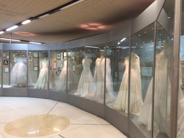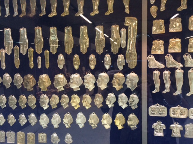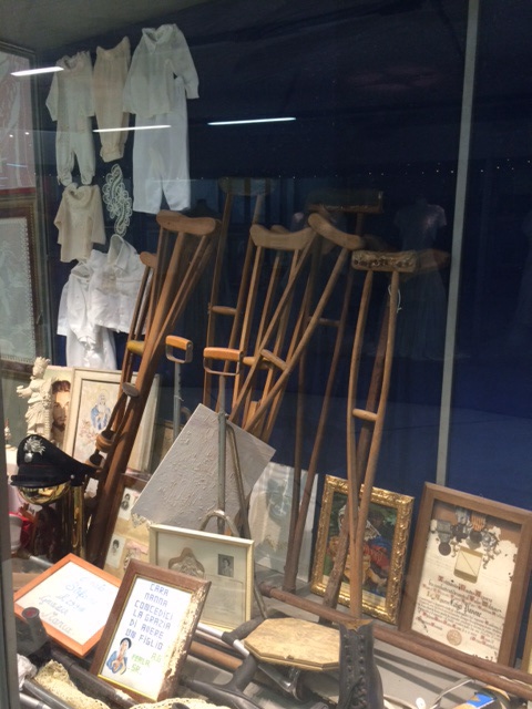 Below in the crypt are the original foundations of the little house. Also, testimony to all the miracles that have happened – braces and crutches no longer needed and many, many thank you messages. Some people have sent metal ornaments of a body part that has been healed, and there are pictures and notes about children who were born after much prayer. There even is a display of several wedding gowns – I’m not sure if their families thought it was a “miracle” the bride finally married, but they obviously were thankful.