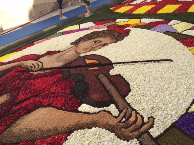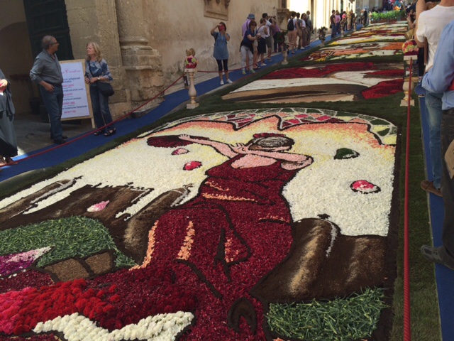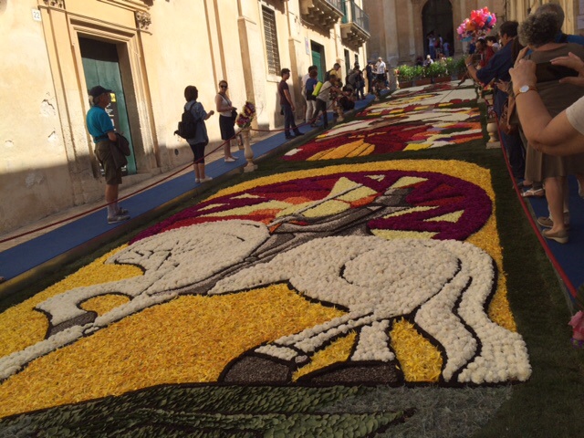The first stop for our merry band of travelers was Noto, a baroque town that is famous internationally for its flower festival – the Infiorata. Groups spend all year designing and putting together works of art made of flowers. They display them in a carpet down one of the streets that ascends to a cathedral. Every item in the display has to be natural, so they get creative with not only flowers, but stems, beans, lentils, and even coffee grinds. It is amazing what they create.