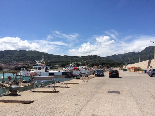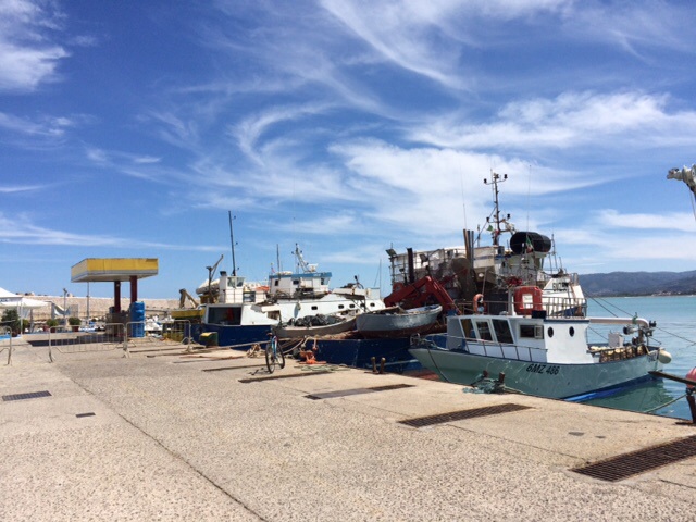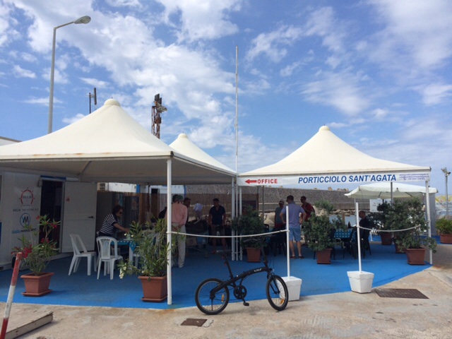 We ditched the rental car (whew) and hired a car service to take us to the boat base. The driver, who takes Americans all over Sicily, had never taken anyone to Porto Sant’Agata di Militello. We drove around a little before spying masts in the distance. We then nervously drove out onto a concrete pier lined with fishing boats (some looking a little derelict). There was a barricade with white tents beyond it and a mobile home-office. Frank got out to check and confirmed this was the place. Our driver looked a little worried about leaving us there, but I told her we would call if there was a problem.