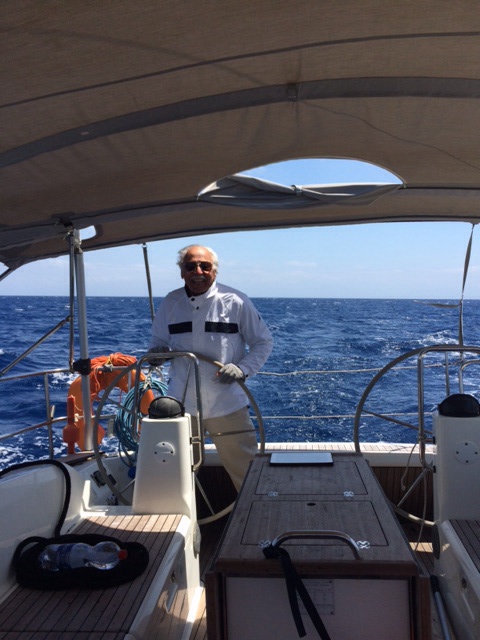 Eventually we made our way to the lee of the Island of Vulcano to get away from the swells, but then had to turn north directly into the wind, which at this time was gusting to 30. Later, we read a (non-sailing) guidebook that said “seeing Vulcano by boat is both dramatic and exhilarating.” We certainly agree! (The pictures of Frank above and below are around Vulcano.)