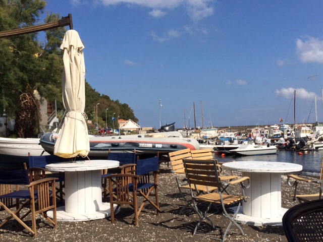 We took stock of our surroundings. We are in a very sheltered spot – Porto Pignataro – about a half-mile from the main town of Lipari. There is a bus that runs every 15 minutes, or it’s a nice walk along the sea. There is no bathhouse, but there is a bar literally on the rocks by the water. We are happy and too tired to care. And there are lots of folks like us – sailors from all over the world to trade stories with about that infamous Aeolian Triangle. We feel right at home.