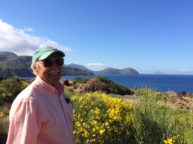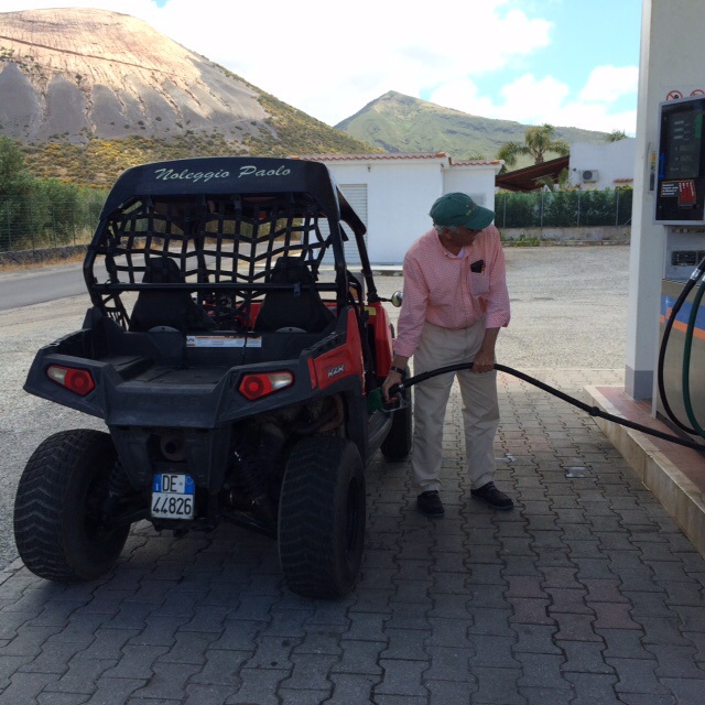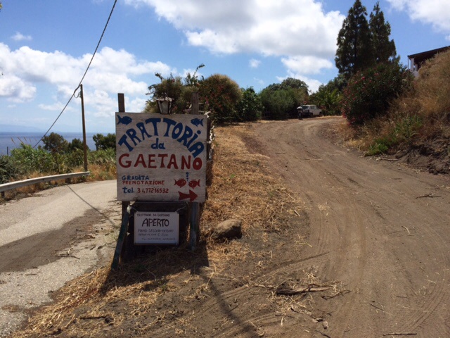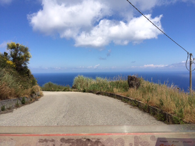 And we had a fabulous time! We rented a little red two-seater that was very loud (Frank says it had a lawnmower engine) and very jerky, but it took us where we needed to go. Our first stop was to fill up with fuel – it runs on benzene, believe it or not. Paolo had given us a rudimentary map, so we took off and explored the island. We drove around the volcanic crater and up and around to the other side before spying a trattoria literally in the middle of nowhere that Paolo had recommended. We stopped for lunch and met a wonderful couple who were born on Vulcano but live part of the year in Australia – they come back in summer to open the restaurant. We had the place to ourselves – with breathtaking sea views and very fresh fish.