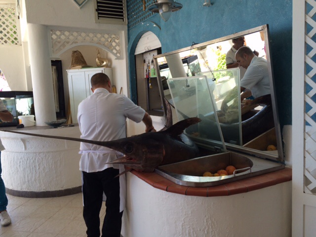 We went to an amazing fish restaurant last night – Grotta Azzurra. They are known for their very fresh catch. The owner came by our table touting all of the colorful seafood on display over ice right outside the front door, including one of my favorites – anchovies. Believe it or not, they are really really good when fresh and marinated- they call them “alice”, pronounced “ah-lee-chee.” They are not at all like the salty kind you find on pizza.