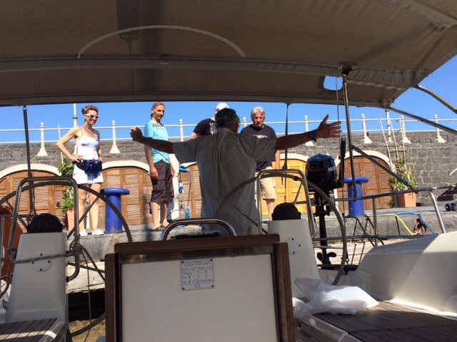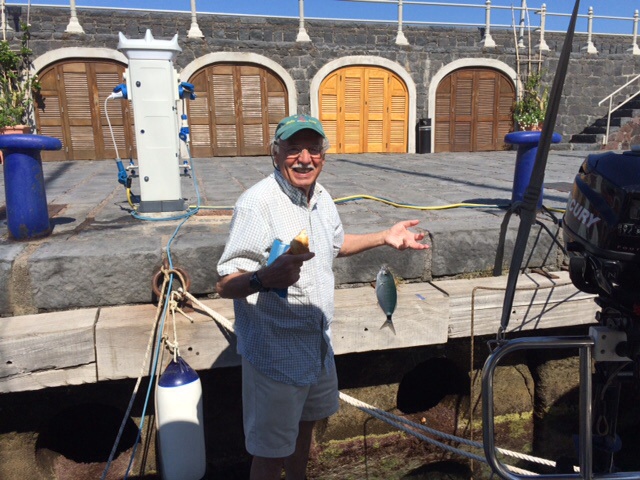 As I wrote before, Frank has been diligently trying to fish from the boat. He consults the local bait shop and tries out new types of fish, bread, and cheese every day – even rice cakes (which the fish liked, but were hard to put on the hook). He also walks up and down the dock talking to anyone else who is interested in fish. They all scratch their heads and come up with new theories in a variety of language – Italian, German, and French. (I am beginning to see how NASA collaboration must have worked to come up with solutions to get to the moon.)