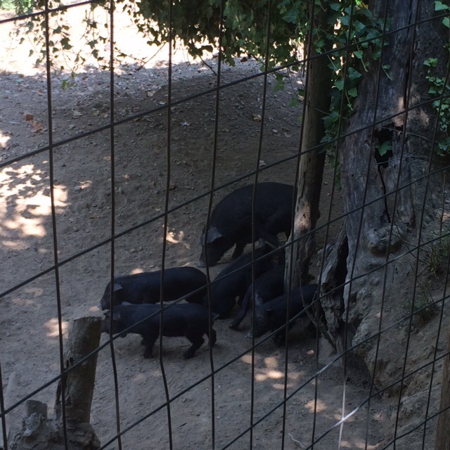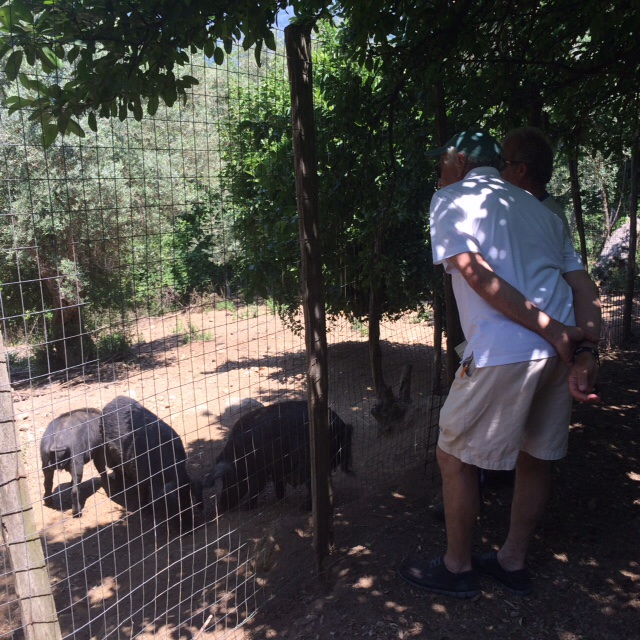 At first we didn’t know what to do with outselves. After all the rushing around – sailing back, getting the boat back in order, and packing, we were at a loss. No schedule, nothing to do, and no WIFI. So we went exploring. Soon we found Chiccho, who has worked on the farm for 45 years. He was off to feed the pigs, so we followed him. We approached a fence – seeing nothing – and he called out in a sing-song voice. Soon a black head popped out of the trees and a gigantic black hog thundered toward the fence, followed by more. Chiccho kept singing and then a teeny black head peeked out tentatively, followed by about a dozen little piglets all in a line. Chiccho said they were 2-weeks to 2-months old.