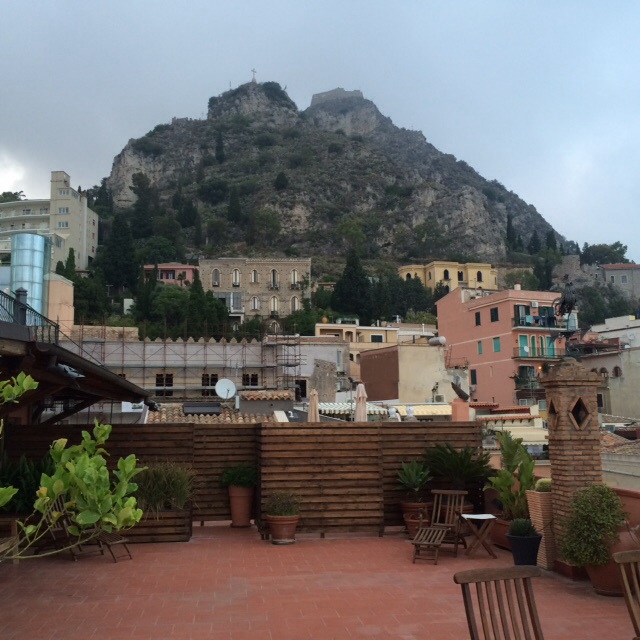 Even better, we have an amazing rooftop terrace that is as big as the apartment. We can see Mount Etna, the sea, and the little mountain town of Castemola where we went in the rain. We can even see the Greek Theatre. The terrace is partially covered with a 6-person table that will be perfect for dinners al fresco at home.