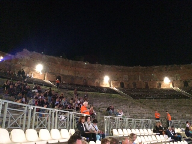 I had heard about the festival and searched the Internet hoping to get lucky and score a ticket. But could find nothing. I figured it must be very private and exclusive. But then we bumped into a British lady who told us, no, just line up for tickets at the festival headquarters near the Greek theatre. We located the headquarters (after passing by it a couple of times) and sure enough, anyone can just walk in. What’s more – tickets are only 6 Euro for reserved seats, 4 Euro if you are willing to sit on the old Greek stones at the top. We splurged for the reserved seats, like the VIPs we are!