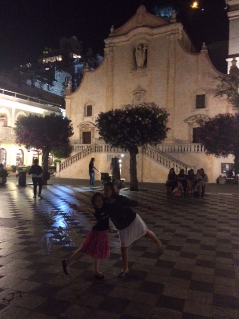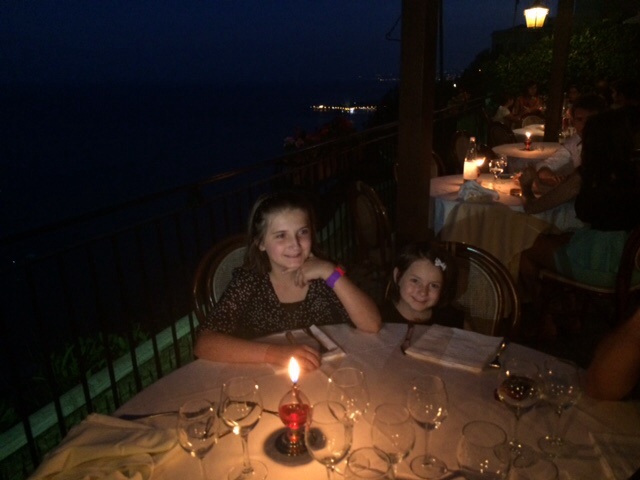 John, Valerie, Cecelia (age 10), and Samantha (age 7) arrived on Tuesday after a long night of flying from America. We had our same driver who has taken us all over, Salvatore, pick them up (since we don’t have a car here). When they arrived, the girls popped out with matching suitcases, cute haircuts, and just seemed at ease right away on the streets of Taormina – telling everyone they meet, “Ciao!”