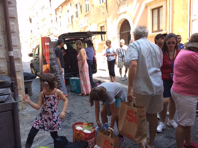 However, we are in a more remote area of Sicily, so things are a little more rustic here. There is air-conditioning in the bedrooms, but we pay by the kilowatt, so we try to use only at night. We cannot turn on more than one major appliance at a time or will blow the circuits. There is a washer, but the “dryer” is the clothesline out back. And, just like on a boat, we have to throw our toilet paper in the trash, not the toilet. (This almost created a mini-mutiny, but everyone seemed to settle in. When in Sicily . . . .)
