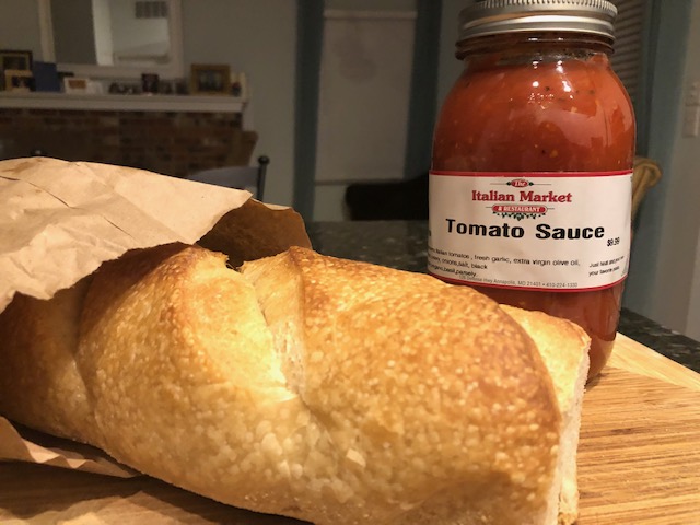 First – the ingredients. We have gone all over town and decided that the very best pane (bread) and salsa di pomodoro (tomato sauce) are at the Italian market in Annapolis. In fact, we go there nearly every single day because Italians only eat fresh bread. Enza knows the whole crowd there and found out that they make the sauce in-house, flying the tomatoes in from Naples every week. Wow! (I admit – it is amazing!)