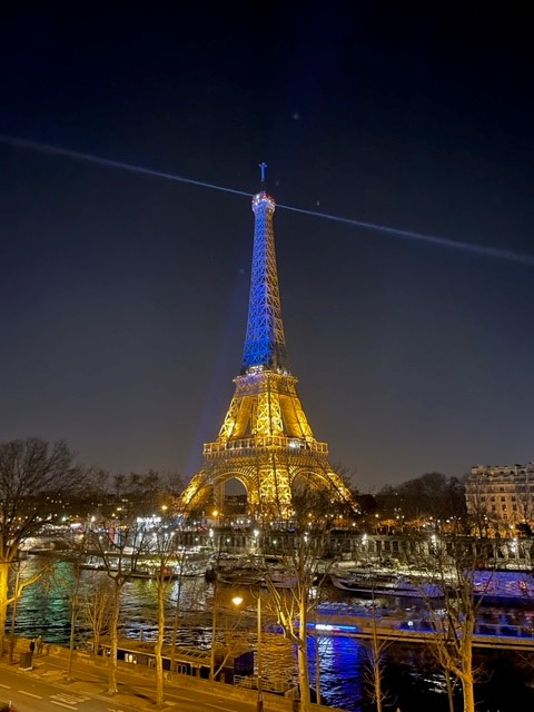 Then we returned to our own neighborhood, where we saw the Eiffel Tower had been lit with the colors of the Ukranian flag.