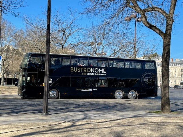 The Bustronome is a double-decker bus outfitted with tables and special cup holders so your wine glasses don’t slide off as you drive around town taking in the sights of Paris.