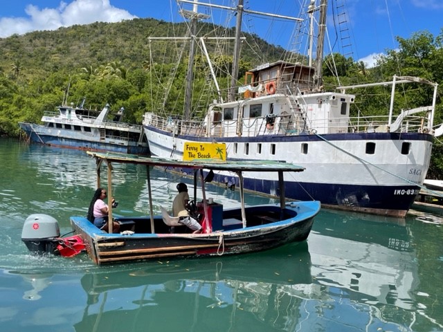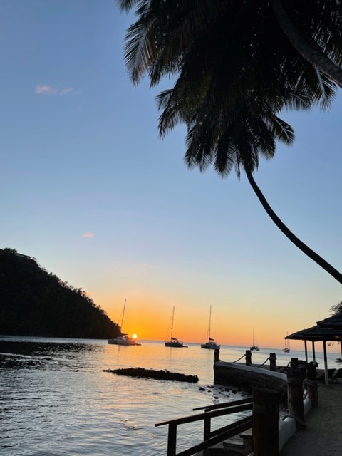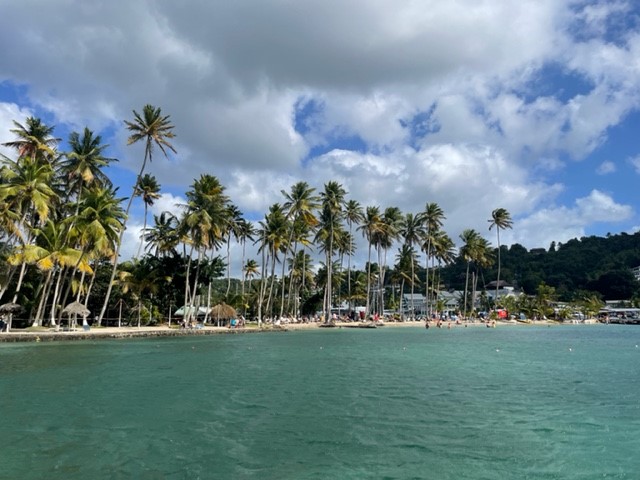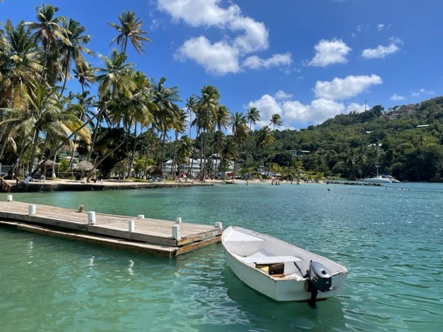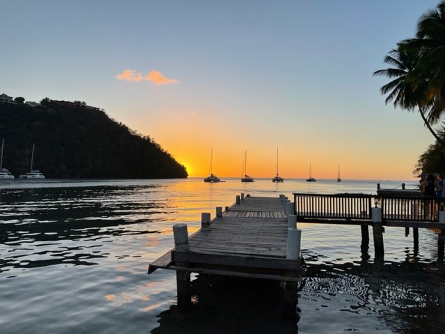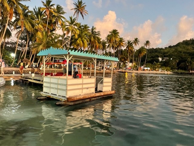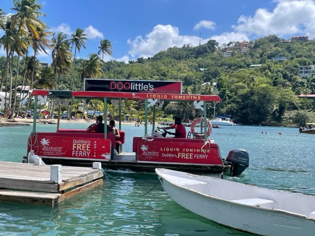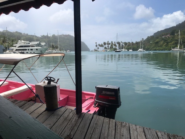 When we were there for lunch, we saw 3 excursions come in by small boat from the big fancy resorts on the island. No doubt these couples had paid a princely sum for a boat ride to beautiful Marigot Bay and an “authentic” lunch on the water. We felt like true insiders as we boarded the little beach ferry back to the Marina Village