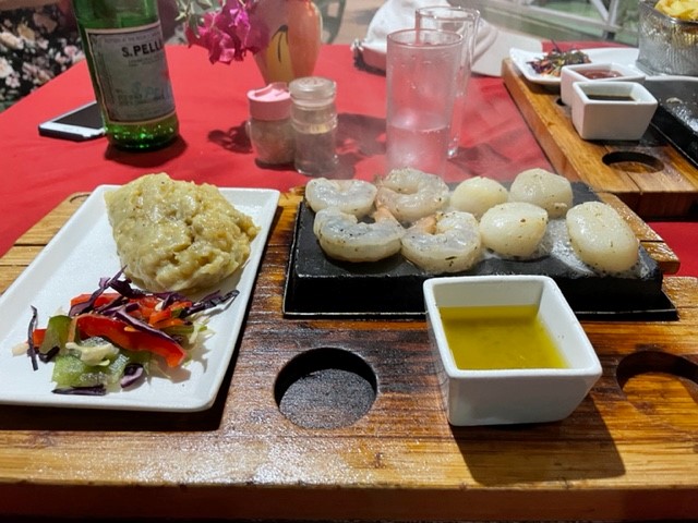 They bring it raw to your table and you cook it yourself. We had salmon, shrimp, and scallops – yum!