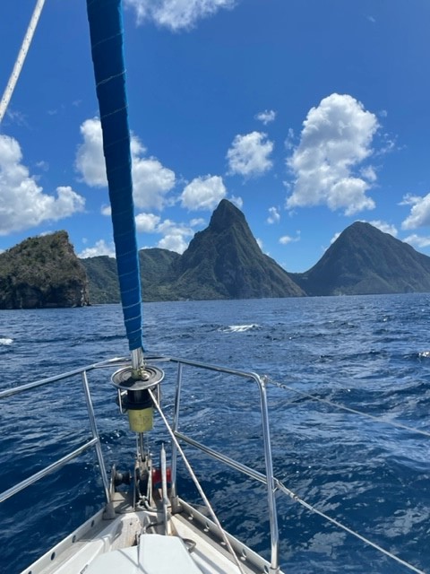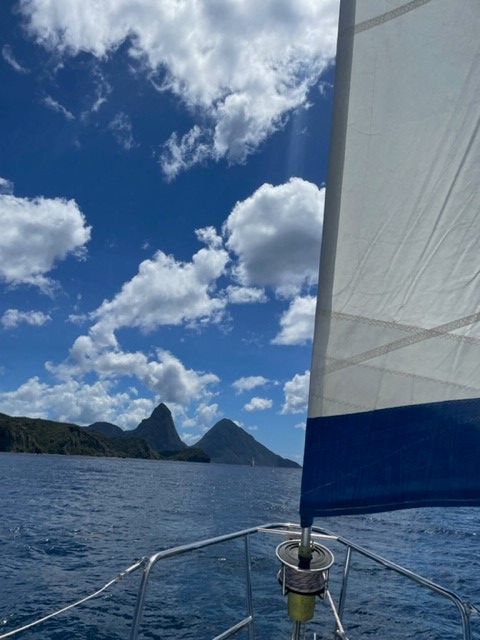 When I left off, Frank and I were sailing with Bateaux Mygo on a private sailboat down the coast of St. Lucia, heading to the Pitons, the twin peaks formed by volcanic activity that are on all the St. Lucian postcards.