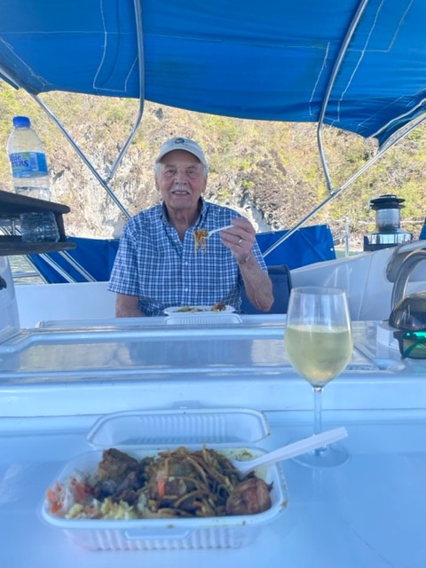 When he returned, we had a wonderful surprise. His aunt lives in Soufriere and had cooked us an authentic St. Lucian feast – grilled chicken, rice, noodles, yams, zucchini – wow. It was really good.